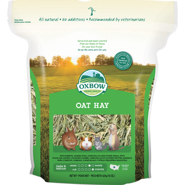 Oxbow Oat Hay is harvested before the oat develops into a seed—the way small herbivores need it and like it! Oat Hay, like all grass hay, meets the nutritional needs of herbivores with high fiber and low protein. This appealing alternative contains savory husks full of both flavor and fiber, making it a favorite for many pets. Blend Oat Hay with other Oxbow grass hays to create a nutty-tasting and nutritious combination.