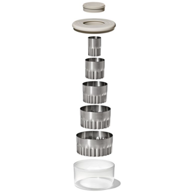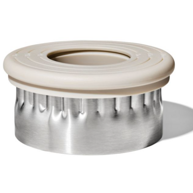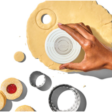 This set includes 5 double-sided cookie cutters (2.5, 4, 5, 6.3, 7.5 cm diameter each) and storage case. One side is flat for cookies; one side is scalloped for biscuits. Soft, non-slip hand guard. Dishwasher Safe.