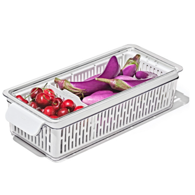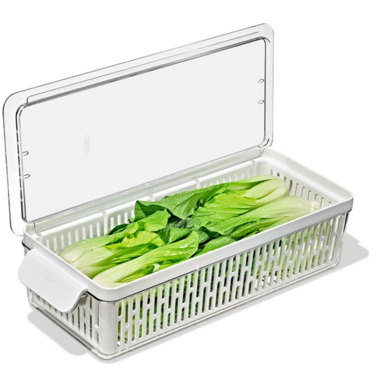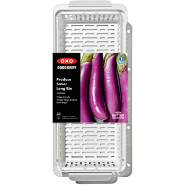 This OXO Long Produce Saver Bin measures 37.5 x 15 x 9 cm. Sized to store carrots, cucumbers, eggplant, celery, scallions and other long veggies. Fridge-friendly and designed to keep produce fresher for longer. Adjustable divider keeps produce organized and visible. Inner basket keeps produce elevated and promotes air circulation. Removable basket is ideal for rinsing produce. BPA Free.