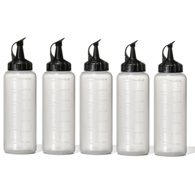 These Squeeze Bottles are perfect for sauces, oils, salad dressings, syrup and more. The attached cap snaps open and closed with one hand. Convenient measurement markings on the translucent body in cups, oz and mL. Comes apart for easy clean-up. Dishwasher safe.
