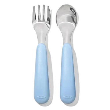 The OXO Tot Fork & Spoon Set is perfect for littles ones learning to self-feed like big kids. The stainless steel Fork tines are rounded but can still spear food, and the matching Spoon is designed for optimal scooping. The curved, non-slip handles are easy for little hands to hold and feature a flat spot to keep the utensils from rolling off tables or high chair trays. Dishwasher safe.