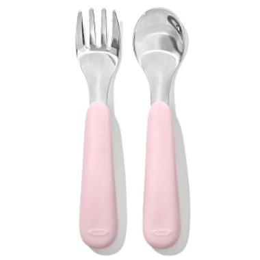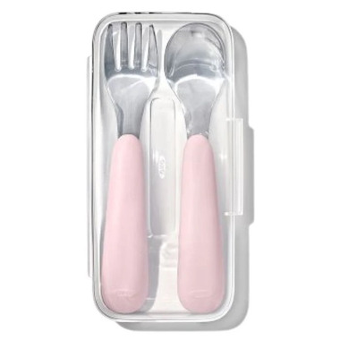 The OXO Tot On-the-Go Fork & Spoon Set was designed for meals while out and about whether thats a picnic in the park, at school or just in the backyard. The stainless steel Fork tines are rounded (to protect little fingers) but can still spear food, and the matching Spoon is extra-deep for optimal scooping. The curved, non-slip handles are easy for learning hands to hold and feature a flat spot to keep the utensils from rolling away. Plus, the compact travel case can be easily tucked into lunchboxes, diaper bags, purses or pockets. Dishwasher safe.