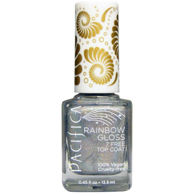This silver top coat (with rainbow opalescent finish) goes on smooth and stays put. Pacifica's new 7 Free Nail Polish is long lasting and void of many chemicals that one would find in traditional nail polish. Plus they have added a custom wide 100% vegan brush for easier application!