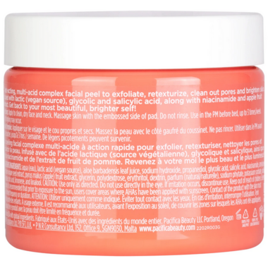 Feeling dull? Peel your way to brighter skin with our multi-acid-complex re-texturizing peel pads. Pacifica's fast-acting combination of [vegan] lactic, glycolic and salicylic acids works to exfoliate, retexturize and deep clean pores, revealing brighter looking, more glowing skin. Apple fruit extract helps add hydration to help soothe skin.