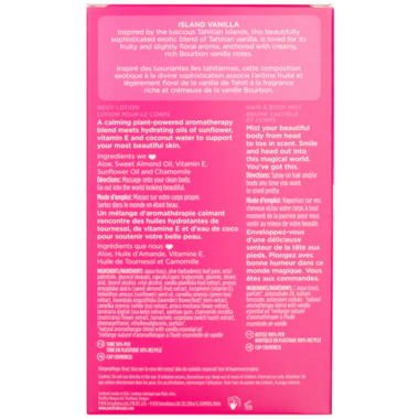 Aqua (Eau), Aloe Barbadensis Leaf Juice, Octyl Palmitate, Glyceryl Stearate, Caprylic/capric Triglyceride, Glycerin, Stearic Acid, Stearyl Alcohol, Cetyl Alcohol, Vanilla Planifolia Fruit Extract, Prunus Amygdalus Dulcis (Sweet Almond) Fruit Extract, Tocopherol (Vitamin E), Helianthus Annuus (Sunflower) Seed Oil, Camellia Sinensis (Green Tea) Extract, Lavandula Angustifolia (Lavender) Flower/leaf/ Stem Extract, Camellia Sinensis (White Tea) Extract, Arnica Montana Flower Extract, Laminaria Digitat (Sea Kelp) Extract, Xanthan Gum, Chamomile Recutita (Matricaria) Flower Extract, Hamamelis Virginiana (Witch Hazel) Extract, Phenoxyethanol, Ethylhexylglycerin, Parfum* *natural aromatherapy blend with vanilla essential oil