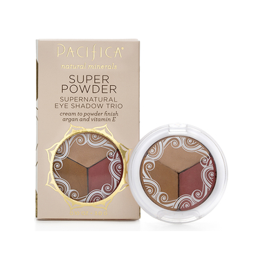 Pacifica Super Powder Supernatural Eye Shadow Trio Breathless, Glowing, Sunset is an innovative natural eye shadow that applies like a cream and sets to a powder, allowing for a smooth, velvety application that blends easy and provides a long-lasting, creaseless, flawless finish. Anti-aging ingredients including jojoba and argan oils.