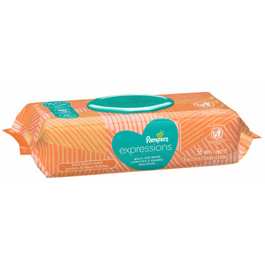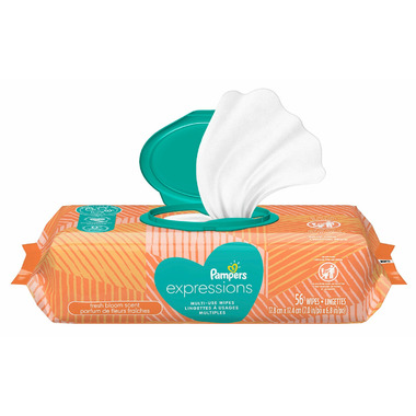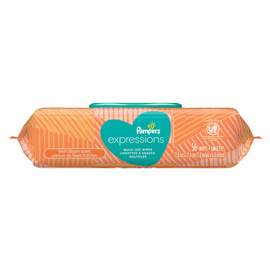Meet the one wipe for everything and everyone. Expressions Multi-Use Wipes by Pampers can be used on body, face, messes, surfaces, and more. Expressions Wipes are gentle enough for faces, yet durable enough to take on tough messes. Free of alcohol, parabens, and latex,* our Fresh Bloom Scent wipes bring a bright, refreshing, and floral scent as you clean. And for less waste, our unique pop-top helps keep wipes fresh, and only dispenses one wipe at a time, so you only get what you need. *Natural rubber