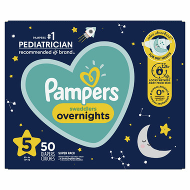 A restful nights sleep starts with the right protection. For dry nights, Pampers Swaddlers Overnights are designed with extra absorbency to lock wetness away from skin for up to 12 hours. Designed to keep skin dry and healthy, Pampers Swaddlers Overnights are the only nighttime diaper with a BreatheFree LinerTM that wicks away wetness and mess, allowing your babyҒs skin to breathe. Our Soft Flexi-Sides provide a soft cushiony stretch for a secure and comfortable fit. Plus, they feature eight nighttime prints for the sweetest dreams. For protection thats gentle on your babyҒs skin, Pampers Swaddlers Overnights are hypoallergenic and free of parabens and latex.* For trusted protection, trust Pampers, the #1 U.S. Pediatrician Recommended Brand. *Natural rubber