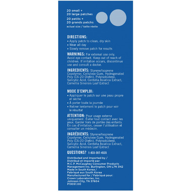 Each box includes 40 patches in two sizes (20 large and 20 small) to address a variety of blemishes. From the makers of the #1 Best-Selling Acne Wash in Canada*, the patches are free from parabens, fragrances, sulfates, dyes, and latex.