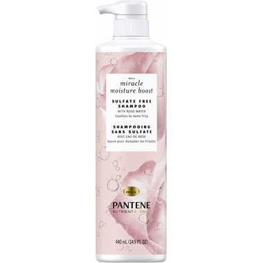 0% Sulfates, Parabens, Dyes, Mineral Oil Want to tame dry hair? Pantene NutrientBlends Miracle Moisture Boost Rose Water Shampoo is your go-to for soothing hydration for thirsty hair.