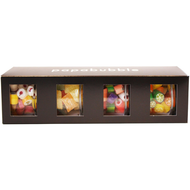 This gift set from papabubble includes handcrafted candies in 4 variety packs. Each set includes: Fruit Salad mix, Citrus Fruit mix, Exotic Fruit mix, and Sours mix.