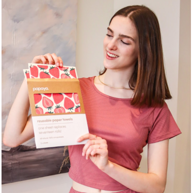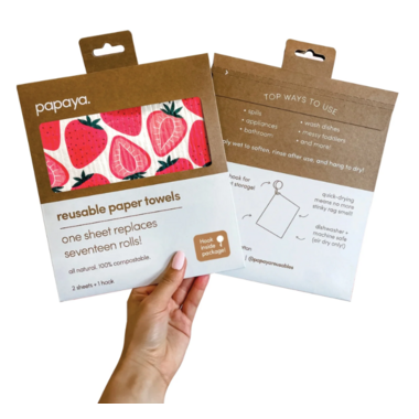 Papaya is the Home of the Reusable Paper Towel - 1 sheet replaces 17 ROLLS of disposable paper towel. Simply use it, rinse it in the sink and hang it to dry on the patented Papaya hook.