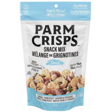 Parm Crisps Snack Mix Ranch delivers the 100% cheese crisp and premium dry roasted nut mix you love, seasoned to savory perfection with a zesty ranch flavor that will elevate your snacking.