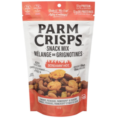 Parm Crisps Snack Mix Screamin Hot delivers the 100% cheese crisp and premium dry roasted nut mix you love, seasoned to savory perfection with a screamin hot spice flavor that will elevate your snacking.