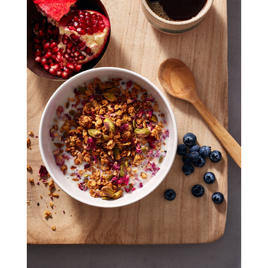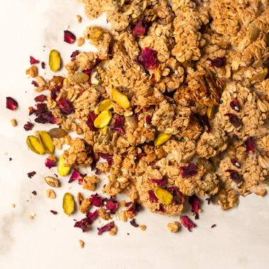 Organic Gluten Free Oats, Sugars (Organic Maple Syrup), Organic Tahini, Pumpkin Seeds, Avocado Oil, Pistachios, Organic Rose Petals, Sesame Seeds, Vanilla Extract, Cinnamon, Sea Salt, Cardamom