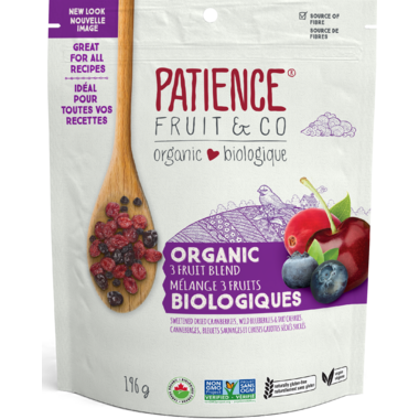 Patience Fruit & Co Organic 3 fruit blend - sweetened dried cranberries, wild blueberries and tart cherries.