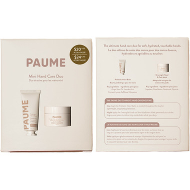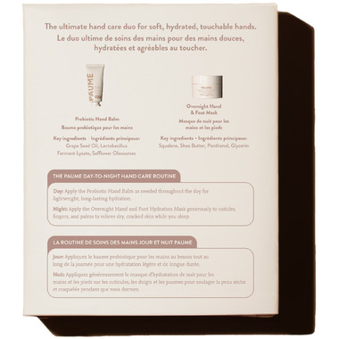 Directions: Apply Balm to hands through the day for fast absorbing hydration. Use the Mask for overnight hydration and repair.