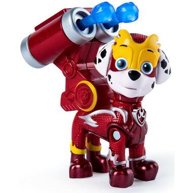 Mighty Pups Super PAWs Marshall is fired up for adventure! Trading his fire uniform for a cool Super PAWs uniform, PAW Patrol’s beloved fire dog wears a shiny metallic uniform with silver accents, a mask and translucent working action pack with water cannon.