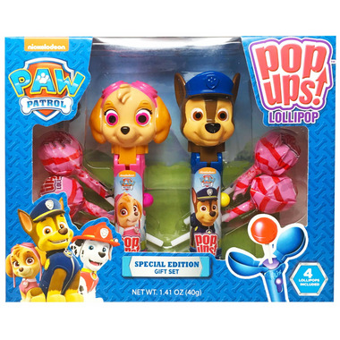 Paw Patrol Pop Ups Lollipop Gift Set includes 2 Pop Ups Figurines and 4 lollipops.