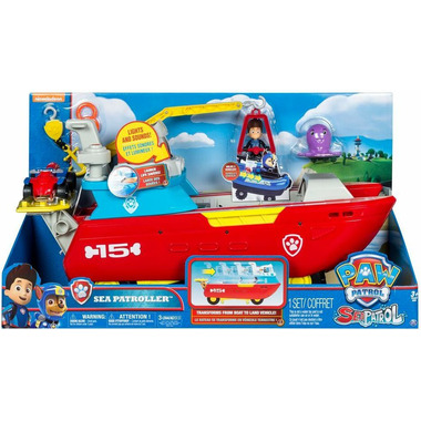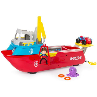 Trouble is on the horizon at Adventure Beach! Help Ryder save Baby Octopus by jumping aboard the Paw Patrol Sea Patroller. Equipped with flashing lights, sounds and a detachable anchor, this rescue vehicle comes with everything you need to sail the high seas. As captain, you’ll have command of the lifesaver launcher, as well as the handy crane and cage – perfect for getting Ryder into hard-to-reach places. This dual boat/ land vehicle can easily tackle rocky roads. Simply slide the bridge forward and wheels drop down, taking you over any terrain. There’s room for all Paw Patrol figures aboard the Sea Patroller (additional figures sold separately). This ship can hold up to 2 vehicles, and comes with Ryder’s Rescue ATV. Load it into the Sea Patroller and use the front-opening ramp to send the Paw Patrol on a roll! For extra-tricky missions that require flight, the helipad on the back of the ship is the perfect launching spot for Skye (sold separately). Whether land, sea or air, the Paw Patrol will be there!