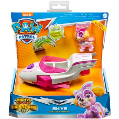 Mighty Skye is ready for mighty action in her Super PAWs Deluxe Vehicle! With Skye (figure included) behind the wheel of her jet, it’s time to race to the rescue! Skye’s Super PAWs Deluxe Vehicle is equipped for action-packed mighty rescue missions, with lights and sounds, expandable wings, and real working wheels!