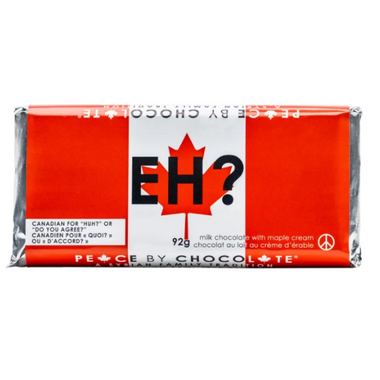 The EH? bar. Canadian for "Huh?" or "Do you agree?". A milk chocolate with maple cream chocolate bar.
