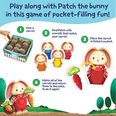 Take toddlers on a colorful adventure of matching and exploring an exciting new discovery: pockets! Little ones pick colorful carrots from a carrot patch and match them to the bunny with the same pocket color. Harvest repeat play with this preschool learning game that toddlers love to experience over and over again!