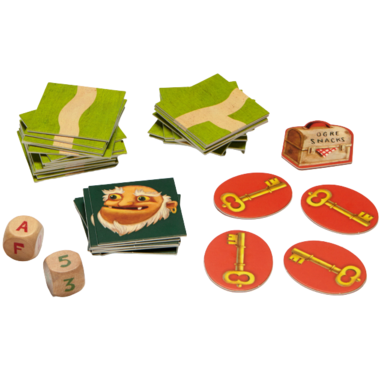 Contains: 1 game board, 1 pair of dice, 37 game cards, 4 key tokens, 1 Ogre snack and instructions.