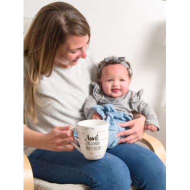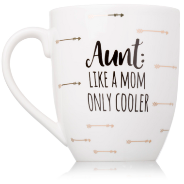 Aunt, like a mom only cooler. Celebrate being promoted to an aunt with Pearhead’s aunt mug. This white, ceramic mug is the perfect way to celebrate your sister becoming an aunt, and she’ll love using it! “Aunt: like a mom only cooler” is printed on the front and back of the mug with matte gold foil arrows printed around the entire mug adding a fun, modern touch. This mug has a large handle to easily hold and carry all your coffee. It fits 2 cups or 16 fluid ounces.