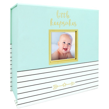 The box is also perfect for decorating your little one’s nursery. Mint, white, black, and gold colours decorate the front of the box with “little keepsakes” and a modern arrow design stamped in gold foil. The box is wrapped in paper and includes a magnet closure to hold the lid down. Cherish all of baby’s special gifts and moments forever with Pearhead’s keepsake box.