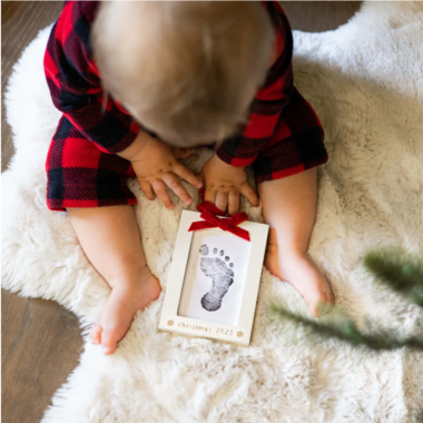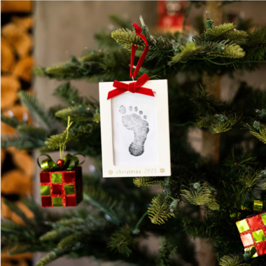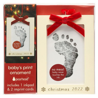 Cherish your little one’s prints this Christmas with Pearhead’s Baby’s Prints Holiday Ornament. This ornament includes a rectangular wooden frame and glass cover with the words “Christmas 2024” and snowflake design, an attached red velvet ribbon bow to hang from your Christmas tree, a turn tab to easily insert your baby’s footprint or handprint, 1 clean touch ink pad, and 2 imprint cards with included instructions. This ornament photo frame is perfect for celebrating baby’s first Christmas. Baby’s handprints or footprints are easy to make. Everything you need is included with the ornament and it’s 100% baby safe. Your baby never even touches the ink! To create an impression, make sure the ink is facing down on the included white card and press your baby's hand or foot onto the clean-touch ink pad. Let dry for 1-2 days. Then you can place the print inside the ornament easily. If you make a mistake, no problem! The ornament includes two cards. The clean-touch ink pad is for two-time use maximum. For newborns only. Ink pads will accommodate hand/feet up to 2.25” wide x 3.5” long.