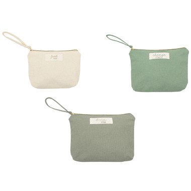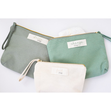 Keep your essentials and baby's must-haves neatly organized in 3 dedicated pouches - labeled "Feed Me", "Change Me", and "Dress Me in modern muted green and neutral cream colors These durable recycled cotton pouches feature zip closures and long carrying loop handles, ensuring your essentials are safe and easily accessible. Our packaging is FSC certified and plastic-free.