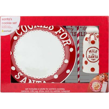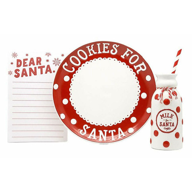 - Includes one cookie plate, one wishlist pad of paper, a ceramic milk bottle, and festive straw