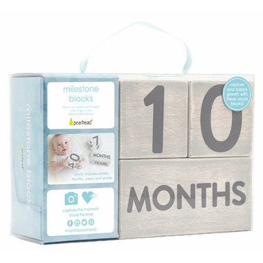 Pearhead's wooden milestone blocks are the perfect addition to your little one's monthly pictures Use the hashtag #mylittlepearhead for a chance to be featured on Pearhead's social media pages Includes 2 small blocks and 1 larger block Blocks include weeks, months, years, and grade and numbers 1-9 Gray blocks with gray lettering Snap a photo with baby next to blocks and share with friends and family Washed and sanded wood