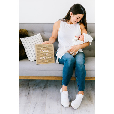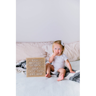 Modern, trendy and fun, Pearheads wooden letterboard is the perfect addition to your little ones nursery and your Instagram pictures. This wooden letterboard includes 188 white letters, numbers, and symbols to personalize and customize your board for all your pictures. Have fun adding in your babys due date and snap a picture of the board next to your pregnant belly. Once baby joins the world, share their birth announcement with this letterboard and add their name, birthdate, and weight. Everyone will love being able to see your adorable little baby and send their well wishes! This board can also be used for your babyҒs monthly posts. The easel makes it easy to prop up next to baby for their pictures and display their message. With the plastic letters included you can have fun personalizing your pictures from month to month. Include things like babys favorite foods to their height and weight. Not using it as a monthly picture board? No problem! This letterboard can be used for any special picture, announcement, or moment. The natural wooden board also includes a sawtooth hanger to easily hang on your wall. Every day you can include a new message for the entire family to see! This letterboard makes the perfect gift for anyone expecting a baby or just because! Have fun wrapping it up and gifting for that special occasion. Use Pearheads wooden letterboard for your fun monthly baby pictures or for any fun pictures! Snap, post, and love! Use the hashtag #mylittlepearhead for a chance to be featured on Pearheads social pages. Product dimensions: 10 W x 10 H x .5 D