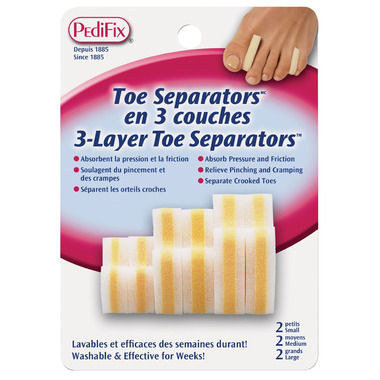 PediFix 3-Layer Toe Separators Separate crooked, overlapping and toes that rub to relieve between toe corns, blisters, pinching and cramping. Soft cushions soothe and prevent irritations by absorbing pressure with their durable, three-layer-foam design.