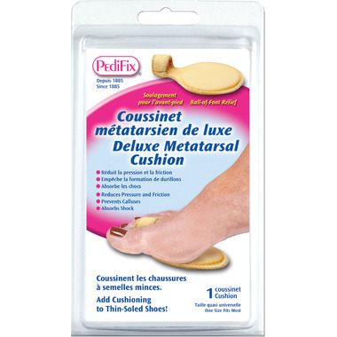 PediFix Podiatrists' Choice Ball-of-Foot Cushion protects forefoot, helps relieve and prevent pain and calluses. Absorbs shock and reduces friction. Soft, double-layer foam pad stays securely in place with a comfortable toe loop. Hand-sewn nylon cover for extra durability. Great for thin-soled footwear. PediFix Podiatrists' Choice Ball-of-Foot Cushion is Interchangeable for right or left foot.