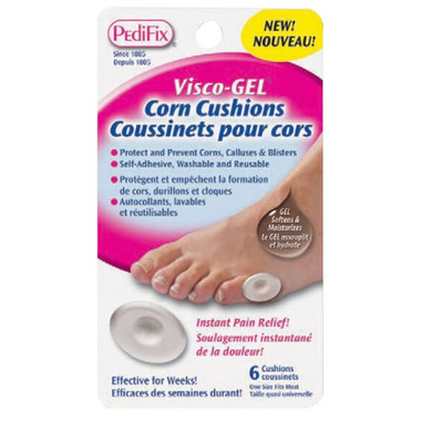 Pedifix® Pedi-GEL Corn Cushions help relieve painful corns. These soft pads feature a ‘relief spot’ to protect corns from shoe pressure and stop friction. Pedifix® Pedi-GEL Corn Cushions can be worn directly on skin or inside shoes. Self-adhesive backing keeps them in place.