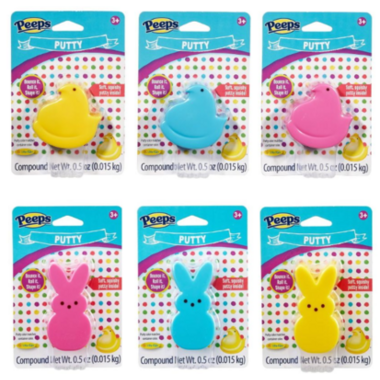 Iconic chick and bunny shaped containers! Putty color matches container. Perfect basket stuffer and candy alternative! Available in three colors.