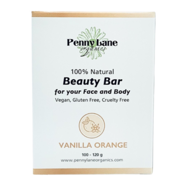 Penny Lane Organics 100% Natural Beauty Bar is freshly scented with Vanilla and Orange essential oil. This handmade soap can be used on the face and body and is a mild cleanser that is great for any skin type.