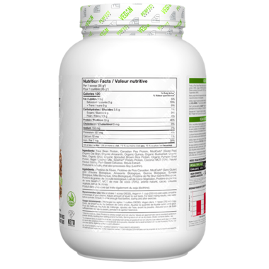 Fava Bean Protein, Canadian Pea Protein, ModCarb {Gluten-Free} (Organic Oat Bran, Organic Amaranth, Organic Quinoa, Organic Buckwheate, Organic Millet, Organic Chia), Organic Sprouted Brown Rice Protein, Organic Pumpkin Seed Protein, Solathin Potato Protein, Vegan Coconut Milk, Coconut MCT (70%), Natural Flavour,Cocoa, Plant-Based Cellulose, Stevia Extract.