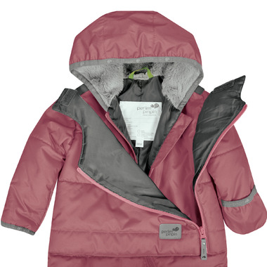 This winter, baby's will be warm with this one-piece snowsuit from Perlimpinpin. New this season, they designed this one piece with a partially removable over-vest to clear the chest from extra filling. The filling-free chest portion makes it easier to adjust the car seat straps closer to the child's body.