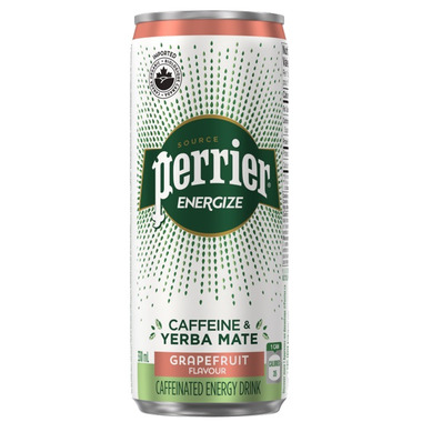 Perrier Energize Grapefruit Caffeinated Energy Drink powered by caffeine extract and the yerba mate leaf.
