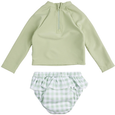 This splash-worthy swim set features a sage long sleeved rash guard and a gingham swim diaper. The rash guard is made from textured recycled polyester, and the zip at the back helps to make the top easy to take off after a day in the sea. The swim diaper has elastic around the waist and legs and both pieces are finished with frilly detailing. All our swimwear is made with UPF50+ sun protection built-in, but never forget to sunscreen any exposed skin!