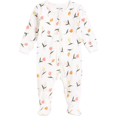 Petit Lem's tulip print is available on sleepers and PJs for older siblings and moms! The organically grown, cotton rib sleeper is super soft and delicate on baby’s skin as they sleep or play with the family. With integrated feet, the sleeper keeps tiny toes warm while they crawl and hunt for eggs. The full-length zipper makes diaper changing quick and discrete without having to remove the whole piece.