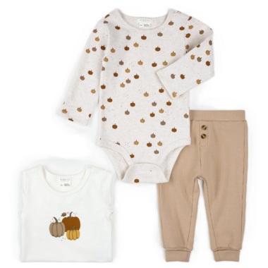 A seasonal set that’s perfect for gifting to autumn arrivals. This three-piece set includes two long-sleeved bodysuits and ribbed pants with an extra-wide waistband for all-day comfort. Featuring a sweet Pumpkin Patch print, it’s ideal for mixing-and-matching for family days out.