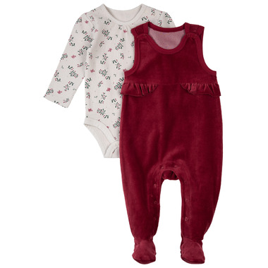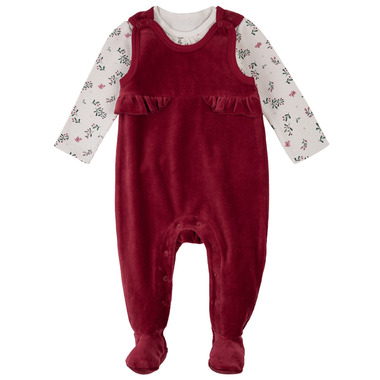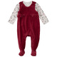 This cozy overall set includes a soft bodysuit and velour overalls with integrated feet. The snug outfit is perfect for keeping your littlest super cozy when visiting family over the festive season. The bodysuit features ours pretty Winterberry Holly print while the overalls have a sweet ruffle trim on the front. Snap buttons on the straps make the overalls easy to remove after another exciting day.