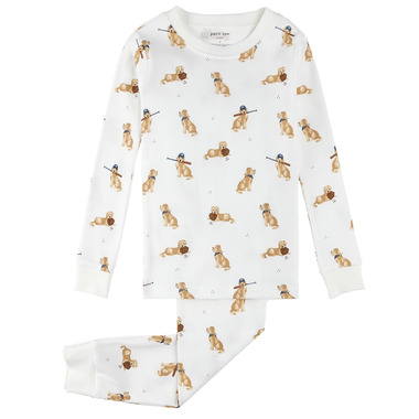 Perfect for families with furry friends, this light and breathable PJ set features a friendly golden retriever heading for their first baseball game. The PJs are designed to match the sleeper from the same range for baby siblings and includes a long sleeved top and long pants. With a rounded neckline and ribbed cuffs, over-the-head dressing is a breeze while the pants easily pull up and down with the elasticated waistband.
