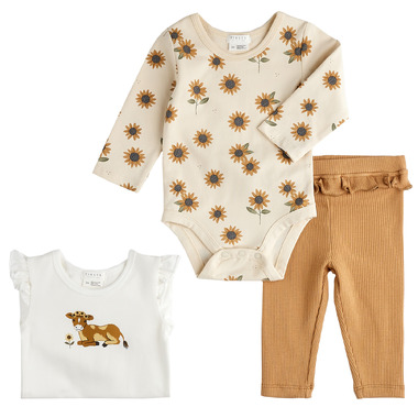 This adorable 3-piece set transforms countryside living into the perfect gift for new arrivals. Featuring an autumnal palette and pretty prints, the set will be ideal for the transition between summer and Fall. The set has two bodysuits with sunflowers and calf prints, and coordinating leggings. The leggings have a frilly trim along the waistband matching the ruffle detailing on the bodysuits. Made from organic cotton, the pieces are light, soft, and stretchy to make dressing easier. As you’ll never have enough vests, this set allows you to keep a spare stashed in the baby bag for messy changes.
