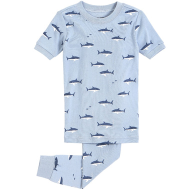 These dusty blue PJs with all over Great White print will keep them cool and comfortable throughout the summer. Made from organically grown cotton rib, the set is light, breathable and soft as a cloud. The two piece set features on short sleeved top and long pants with an elasticated waistband for a simple and practical fit that lasts all day or night.